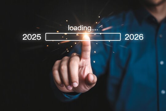 Hand Touching Loading Screen, Digital Progress of 2026, Futuristic Business Concept, Technology Interface, Businessman Interacting with Virtual Display, Loading New Year 2026.