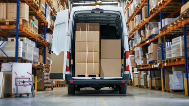 Courier van being loaded by delivery professional in warehouse