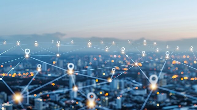 A digital illustration of a cityscape with glowing location markers connected by lines, representing a network or internet connection