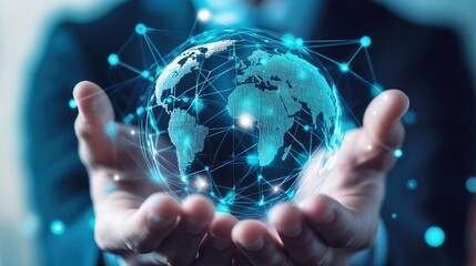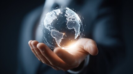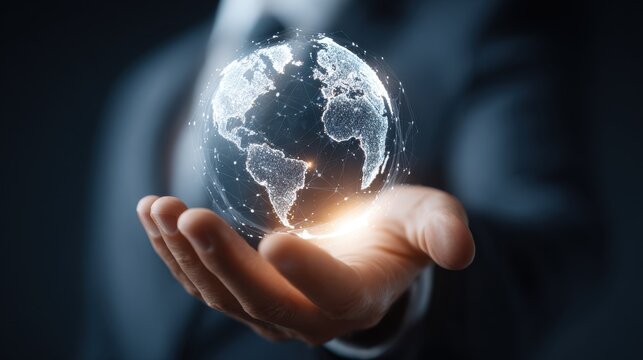 Businessman holding digital globe with multiple language texts, symbolizing translation, localization, multilingual communication, global business, international marketing, and worldwide connection.