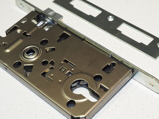 Conventional mortise lock for door. New door lock mechanism. Home security. Broken door lock