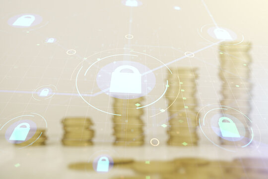 Virtual creative lock illustration with microcircuit on modern interior background, cyber security concept. Multiexposure