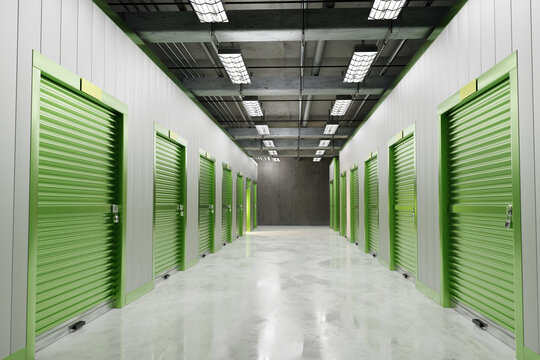 Rental Storage Units. Self storage unit cutaway. Storage box with green door. 3d image,
