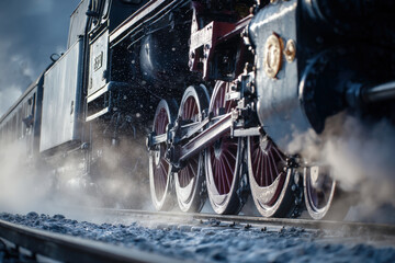 steam locomotive with steam clouds in winter, front view, Slovakia
