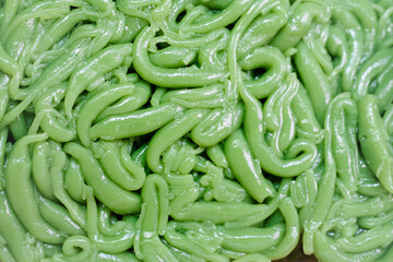 Coconut syrup on rice noodles made of rice eaten with coconut cream with taro, Lod Chong, Singapore rice noodle, traditional Thai desserts in Thailand.