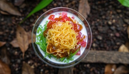 flatlay of authentic Indonesian es cendol dessert in a glass