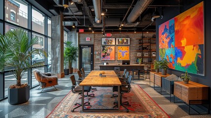 A vibrant co-working office space blending industrial design elements with bold artwork, comfortable seating, and ample natural light.
