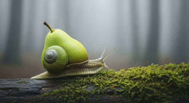 A snail carrying a pear sits on a mossy log in a misty forest scene