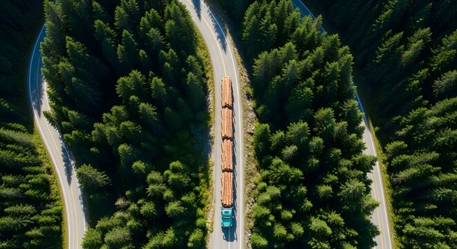 High angle shot of a colored logging truck carrying a long load of timber along a winding road surrounded by dense green coniferous forest. The road curves through the trees
