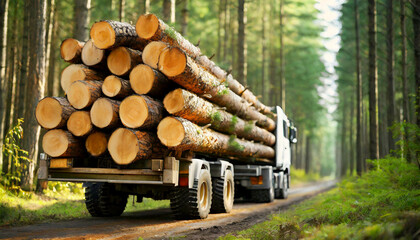 Close-up and rear view of a large truck carrying wooden logs of pine trees in a green forest. Lumber industry and deforestation concept. Generative Ai.