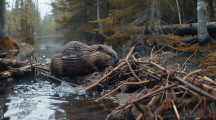 Beaver dam. beaver in the wild. large beaver dam made of branches on the river