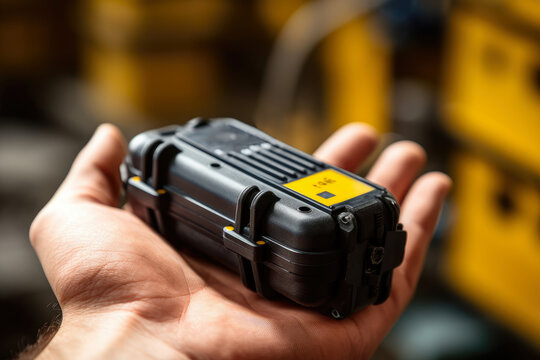 Macro shot of a rugged data logger being used to monitor and record vibrations in heavy machinery on a factory floor