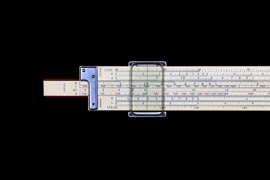 Pencil, old slide rule and scientific electronic calculator page with the calculations in progress