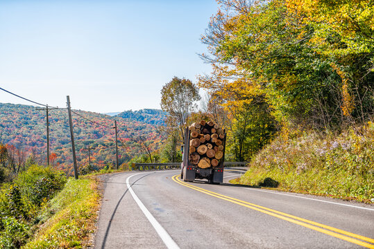 Industrial heavy duty truck trailer hauler delivering wood lumber on highway road in colorful autumn in West Virginia, USA