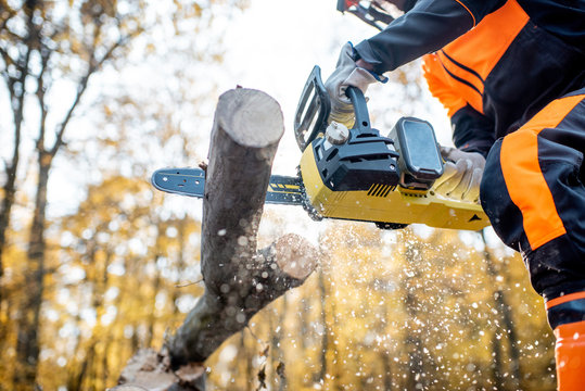 Professional lumberjack sawing wooden logs with a chainsaw, close-up view with a sawdust