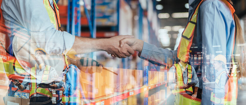 Warehouse Worker Handshake for partnership in logistic center, Industrial worker talking and deal for business in storehouse. Working in Distribution Center. Banner and Double Exposure Background.