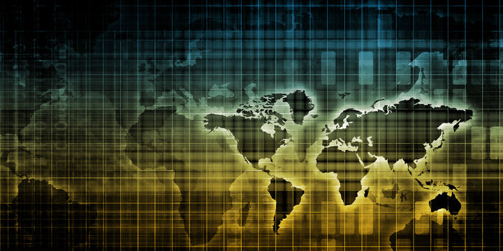 A detailed map with shipping containers highlights global trade connections, showcasing logistics and supply chain management across continents.