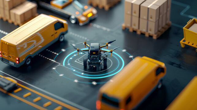 Futuristic logistics concept with drones and delivery trucks in a sorting center. Innovation in parcel transportation and smart technology.