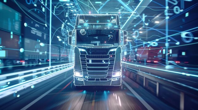 Futuristic Convoy of Autonomous Freight Trucks in 3D Render for Innovative Transportation Management,