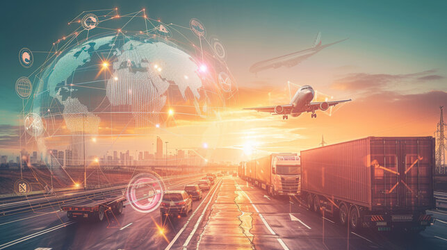 dynamic transportation and logistics concept, showcasing various modes of freight transport such as trucking and aviation, integrated with digital connectivity and global networking.