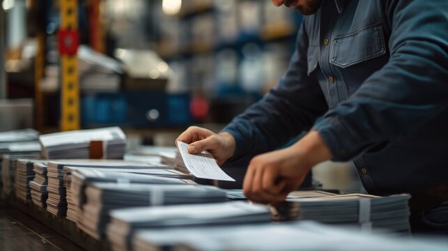 Man sorting paperwork in warehouse, concept of logistics, organization, and business operations