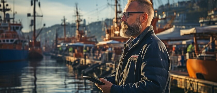 logistician in  hard hat and reflective vest reviews  tablet amidst stacked shipping containers at  port beside  cargo ship
