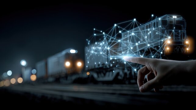 Closeup medium shot of a hand interacting with a holographic blockchain network above freight trains emphasizing efficiency in rail cargo tracking and management.