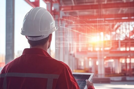 Engineer in factory reviews production data on laptop. Wears safety helmet, sits at table in modern factory. Industrial machines blurred in background. Scene shows tech worker analyzing production