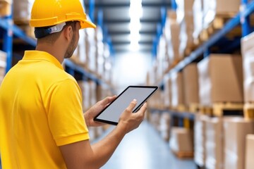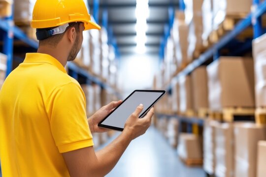 Warehouse worker utilizing a tablet to streamline inventory management and optimize smart storage solutions in an efficient e-commerce operation