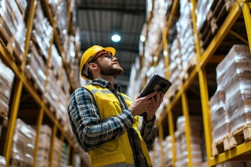 Warehouse worker inspecting inventory with tablet and hard hat for digital logistics