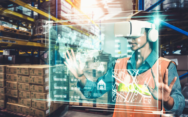 Future virtual reality technology for innovative VR warehouse management . Concept of smart technology for industrial revolution and automated logistic control .