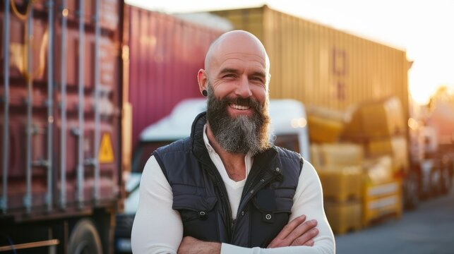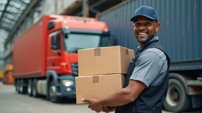 Delivery, container and happy truck driver moving industry cargo and freight at a shipping supply chain or warehouse. Smile, industrial and black man ready to transport ecommerce trade goods or stock