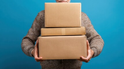 "Delivery in Motion: Man Holding Cardboard Boxes on Blue Background"