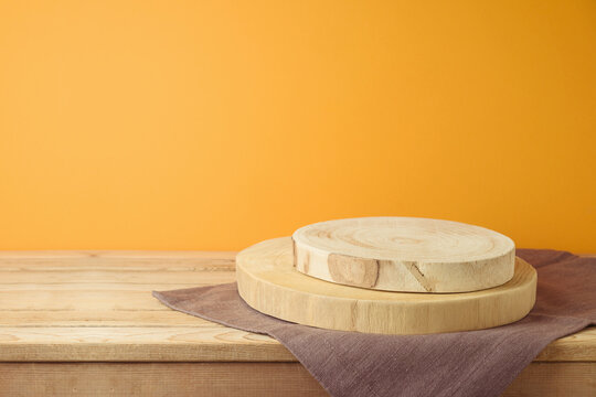 Empty log podium with tablecloth on wooden table over orange wall background. Thanksgiving  mock up for design and product display