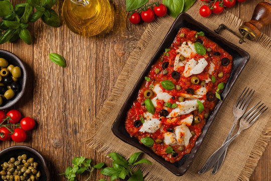 A rustic dish of bacalao a la riojana, salt cod with a rich tomato and pepper sauce, served in a clay pot