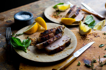 Freshly sliced raw tuna loin fillet, packed with flavor and nutrients, waiting to be transformed into exquisite seafood dishes. black background. top view