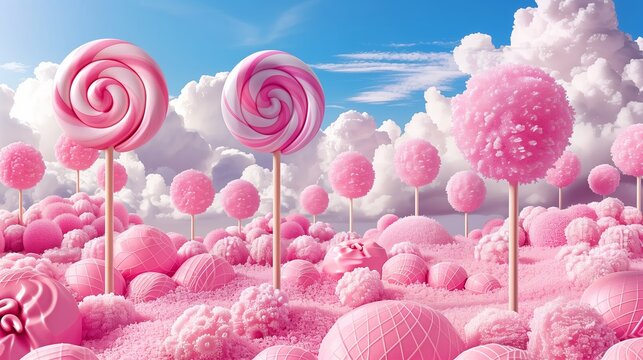 Candy land landscape features pink lollipop trees. Sweet river flows through confectionery scenery. Whimsical world with sugary mountains. Dessert dream. Ideal for confectionary sweets themes design.