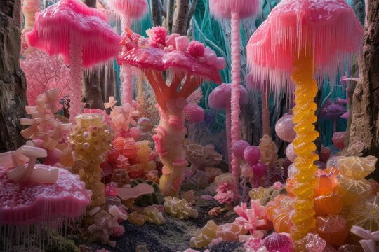Explore the whimsical and dreamlike enchanted candy forest scene filled with vibrant and colorful flora, including candy trees, lollipop bushes, and marshmallow mushrooms