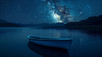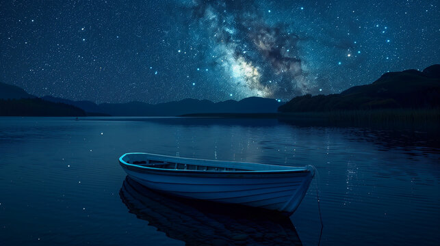 Calm lake at night with a boat, stars twinkling in the sky