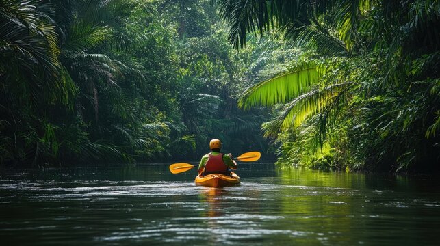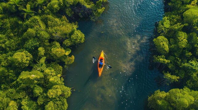 A lone kayaker glides through a serene mangrove forest, highlighting the tranquility and beauty of nature, suitable for travel brochures and adventure-themed content.