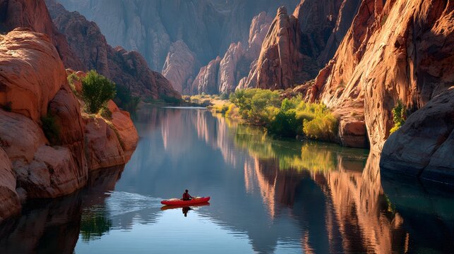 Canyon river curves like a shiny ribbon with cliffs and a lone kayaker drifting peacefully.