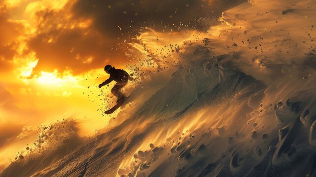 A lone surfer skillfully navigates a large wave as the sun sets, casting vibrant golden light across the ocean, creating a breathtaking coastal view.