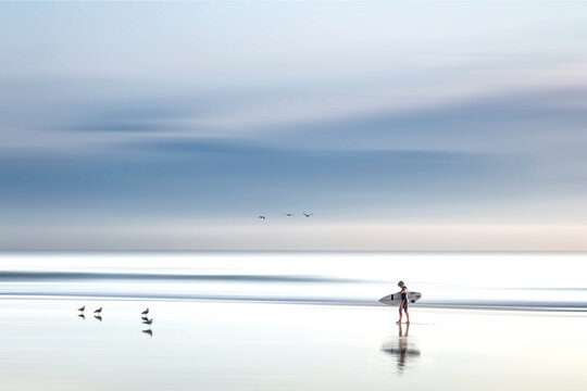 Imagine a lone surfer enjoying a peaceful sunset surf session. The sky is painted with hues of orange and pink, and the waves gently roll in.