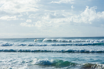 Aerial view of serene beach with lone surfer riding smooth waves in tranquil turquoise water : Generative AI