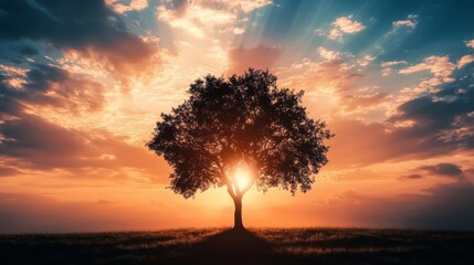 Silhouette of a lone tree against a dramatic sunset sky with sun rays breaking through the clouds