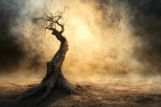A lone, gnarled tree stands resiliently in a desolate, dust-filled landscape under a moody sky.