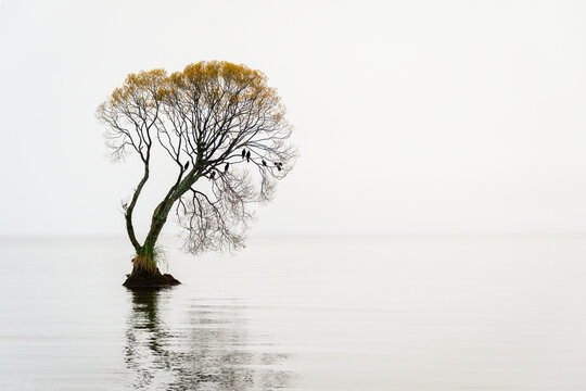 Birds perched on an autumn tree in Lake Taupo.