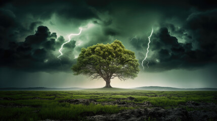 Solitary tree standing in field under stormy sky, mist rising, moody & evocative landscape painting ambiance