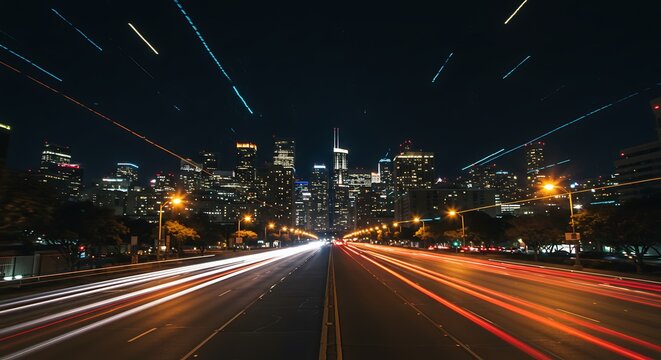 Night Cityscape: Dynamic Light Trails and Illuminated Skyscrapers at Night