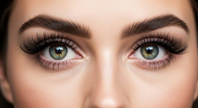 Close-up of young caucasian female's eyes with thick eyebrows and long eyelashes